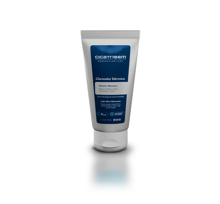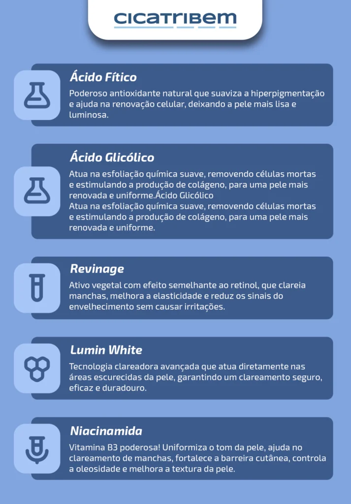 O Clareador Dérmico Cicatribem contém Niacinamida, Ácido Fítico, Ácido Glicólico, Revinage e Lumin White – uma combinação poderosa para clareamento eficaz, renovação celular e uniformização do tom da pele.